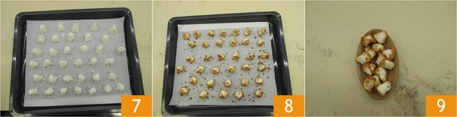 Legen Sie die kleinen Kegel nach und nach auf ein mit Backpapier ausgelegtes Backblech und halten Sie dabei ausreichend Abstand 7; daraus ergeben sich etwa 35 Stück. Dann backen Sie sie im vorgeheizten Umluftofen bei 190° etwa 10 Minuten lang, bis sie an der Oberfläche goldbraun sind. Nehmen Sie Ihre glutenfreien Kokosplätzchen aus dem Ofen 8 und lassen Sie sie abkühlen, bevor Sie sie umsetzen, da sie heiß weich sind und brechen könnten. Sobald sie abgekühlt sind, können Sie sie servieren 9.