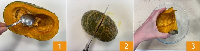 Um die glutenfreien Kürbisgnocchi zuzubereiten, entfernen Sie zuerst die Samen und inneren Fasern vom Kürbis 1, dann schneiden Sie ihn in zwei Hälften 2 und legen ihn in eine mit Frischhaltefolie abgedeckte Schüssel. Kochen Sie ihn 10 Minuten lang bei 800 Watt in der Mikrowelle 3.