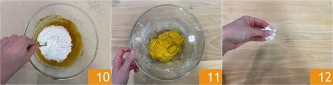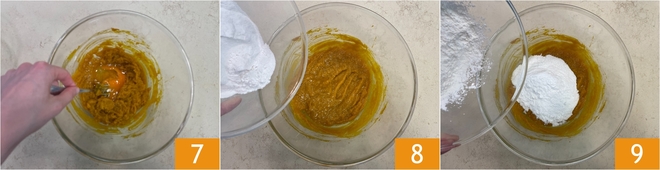 Vermischen Sie alles gut, bis das Ei vollständig aufgenommen ist 7, dann fügen Sie das Reismehl 8 und die Maisstärke 9 hinzu.