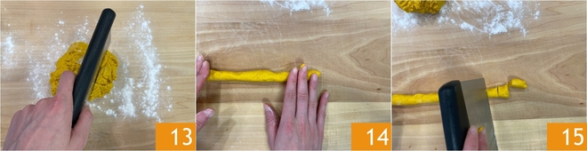 Teilen Sie den Teig mit einem Teigschaber in kleinere Portionen 13 und formen Sie daraus Rollen 14, und schneiden Sie dann 1 cm große Stücke 15.