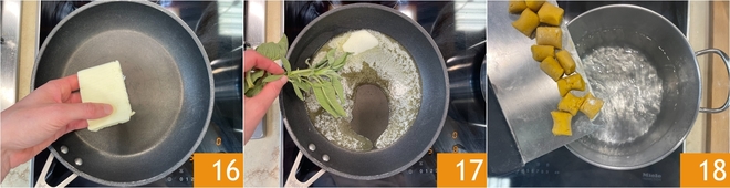 Nachdem alle Gnocchi geformt sind, gehen Sie zum Kochen über: Lassen Sie die Butter 16 in einer Pfanne mit den Salbeiblättern 17 schmelzen. Kochen Sie die Gnocchi in gesalzenem, kochendem Wasser 18.
