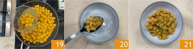 Sobald sie an die Oberfläche schwimmen, schöpfen Sie die Gnocchi in die Pfanne mit der Sauce 19. Anrichten 20 und sofort die glutenfreien Kürbisgnocchi servieren 21!
