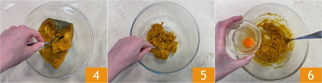 Nach dem Kochen entnehmen Sie das Kürbisfleisch mit einem Löffel 4 und lassen es abkühlen. Dann zerdrücken Sie den Kürbis mit einer Gabel 5 und fügen das Ei hinzu 6.