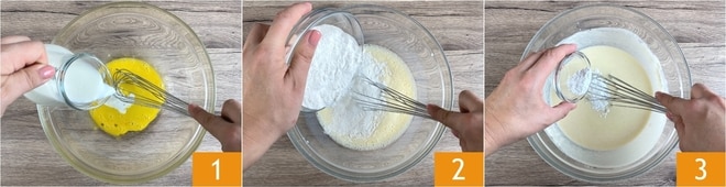 Um die glutenfreien Pfannkuchen zuzubereiten, schlagen Sie zuerst das Ei mit dem Zucker in einer Schüssel mit einem Schneebesen auf, dann beginnen Sie, die Milch nach und nach hinzuzufügen, während Sie weiter rühren 1. Fügen Sie das Mehl hinzu 2 und rühren Sie, um alle Klumpen zu entfernen 2, dann geben Sie das Backpulver hinzu 3.