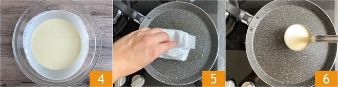 Rühren Sie weiter, bis Sie einen glatten und homogenen Teig erhalten 4. Fetten Sie eine antihaftbeschichtete Pfanne mit etwas Öl ein und entfernen Sie den Überschuss mit einem Küchenpapier 5, dann geben Sie eine Kelle Teig hinein 6 und braten Sie bei niedriger Hitze.