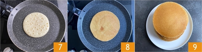 Wenn an der Oberfläche Bläschen zu sehen sind 7, drehen Sie den Pfannkuchen mit einem Spatel um und braten Sie weiter, bis er auch auf der anderen Seite goldbraun ist; das dauert etwa 1-2 Minuten pro Seite 8. Fahren Sie auf diese Weise fort, bis alle Pfannkuchen gebraten und gestapelt sind, sobald sie fertig sind. Ihre glutenfreien Pfannkuchen sind bereit, genossen zu werden 9!