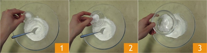 Um Ihre Piadina zuzubereiten, beginnen Sie damit, in einer Schüssel den glutenfreien Mix, das Salz 1 und das Natron 2 zu vermischen. Machen Sie mit einem Löffel eine kleine Mulde in der Mitte und geben Sie das ganze Wasser hinein 3.