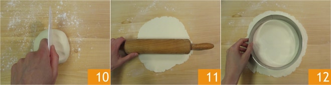 Nach der erforderlichen Zeit nehmen Sie den Teig aus dem Kühlschrank und legen ihn auf eine leicht bemehlte Arbeitsfläche. Schneiden Sie den Teig mit einem Teigschaber in 4 Teile 10 und rollen Sie einen Teil mit einem Nudelholz auf eine Dicke von 2 mm aus 11. Stechen Sie nun Ihren Teig mit einem 20 cm Durchmesser Ausstecher 12 aus, um eine Scheibe zu erhalten.