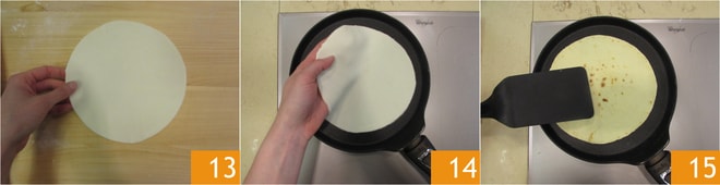 Die Piadina ist bereit zum Kochen 13. Erhitzen Sie eine beschichtete Pfanne auf mittlerer Hitze und lassen Sie sie einige Minuten lang aufheizen. Nun legen Sie Ihre Piadina in die Pfanne und lassen Sie sie weiter mit der Hand drehen 14, um Blasenbildung zu vermeiden. Sobald eine Seite gekocht ist (es dauert einige Minuten), können Sie sie umdrehen und den gleichen Vorgang wiederholen 15.