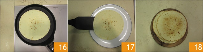Sobald sie gekocht ist, legen Sie die Piadina auf einen Teller 17. Machen Sie so mit den restlichen Teigstücken weiter. Kneten Sie auch die restlichen Schnittstücke, um zwei weitere Piadine zu erhalten. Sobald alle glutenfreien Piadine gekocht sind 18, können Sie sie nach Belieben füllen!