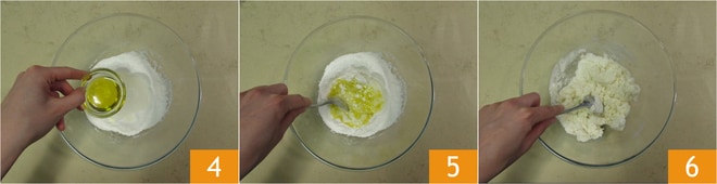 Gießen Sie auch das Öl dazu 4 und mischen Sie alles zunächst mit dem Löffel 5, um die Flüssigkeiten aufzunehmen 6.