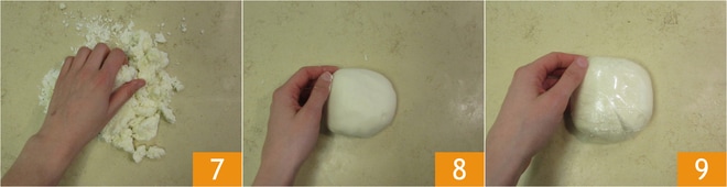 Geben Sie die Mischung auf die Arbeitsfläche und kneten Sie sie mit den Händen weiter 7 für einige Minuten, bis der Teig glatt und homogen ist 8. Lassen Sie den Teig 20 Minuten im Kühlschrank ruhen, eingewickelt in Frischhaltefolie 9.