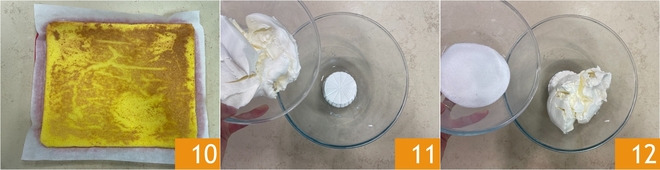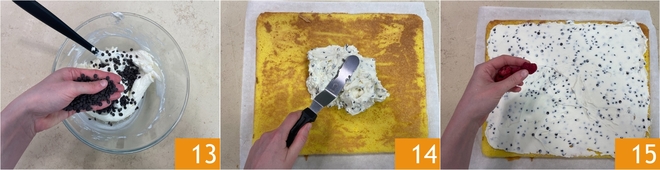 Lassen Sie den Biskuit etwas abkühlen 10. In der Zwischenzeit bereiten Sie die Creme zu: In einer Schüssel arbeiten Sie Ricotta mit Mascarpone 11, bis eine glatte und homogene Konsistenz entsteht. Fügen Sie den Puderzucker hinzu und mischen Sie erneut 12. Geben Sie 1/3 der Creme in einen Spritzbeutel, er wird für die endgültige Dekoration benötigt.