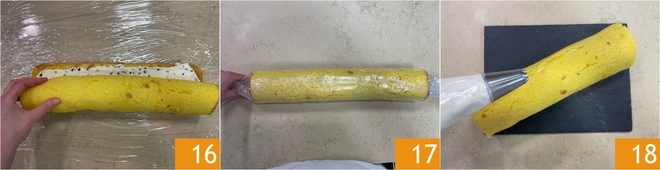 Beginnen Sie, das Dessert zu rollen, und legen Sie es dann auf ein Stück Frischhaltefolie 16. Wickeln Sie es vollständig in die Folie, um die Form zu stabilisieren 17, und lassen Sie es für mindestens 1-2 Stunden im Kühlschrank ruhen. Sobald es fest geworden ist, legen Sie es auf eine Servierplatte und dekorieren die Oberfläche mit Restcreme-Tuffs 18.