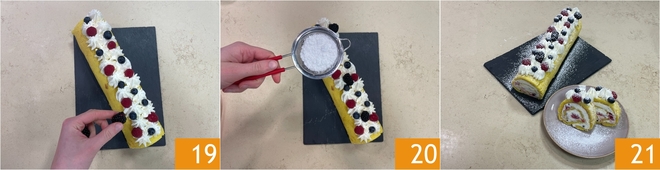Fügen Sie Himbeeren, Heidelbeeren und Brombeeren wechselweise hinzu für einen eleganten und eindrucksvollen Effekt 19. Zum Abschluss bestreuen Sie es leicht mit Puderzucker 20. Die gluten- und laktosefreie Rolle ist bereit, serviert zu werden 21.