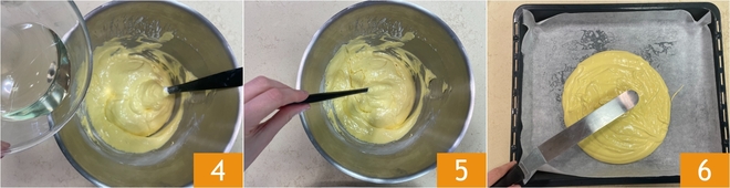 Zum Schluss geben Sie das Pflanzenöl hinzu 4 und mischen es mit langsamen, kreisenden Bewegungen, um die weiche Struktur der Mischung zu erhalten 5. Nun bereiten Sie das Backblech vor, indem Sie es mit Backpapier auslegen, und streichen Sie den Teig mit einem Spatel darauf 6.