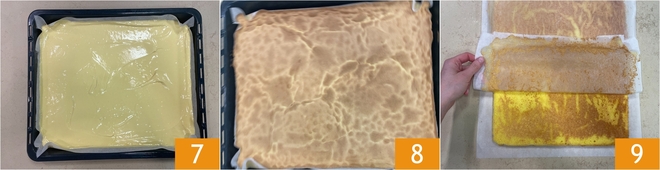 Glätten Sie ihn gleichmäßig 7. Backen Sie ihn im statischen Ofen bei 190°C für etwa 17 Minuten, bis die Oberfläche eine leichte Bräunung annimmt 8. Sobald er fertig ist, stürzen Sie ihn sofort auf ein Blatt Backpapier 9 und entfernen Sie das darunterliegende.