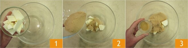 Um die glutenfreien Weihnachtsplätzchen zuzubereiten, geben Sie die weiche Butter 1, den braunen Zucker 2 und einen Teelöffel Ingwer 3 in eine Schüssel.