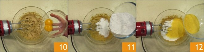 Fügen Sie auch die 2 Eigelb hinzu und arbeiten Sie weiter, bis sie eingearbeitet sind 10. Geben Sie das Reismehl 11 und das Maismehl 12 hinzu.