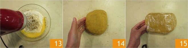 Rühren Sie weiter mit den Rührbesen, bis die beiden Mehle gut aufgenommen sind 13. Wenn Sie eine homogene Masse erhalten haben, übertragen Sie sie auf eine Fläche und formen Sie sie zusammen 14. Formen Sie einen Teig, wickeln Sie ihn in Frischhaltefolie 15 und legen Sie ihn für mindestens eine Stunde in den Kühlschrank.