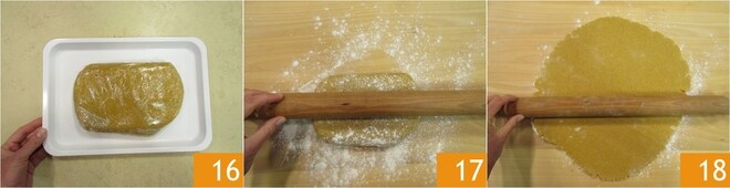 Wenn der Mürbeteig fest geworden ist, nehmen Sie ihn aus dem Kühlschrank 16. Übertragen Sie ihn auf eine bemehlte Arbeitsfläche und rollen Sie ihn mit einem Nudelholz 17 aus, bis Sie eine Dicke von 1 cm 18 erreichen.