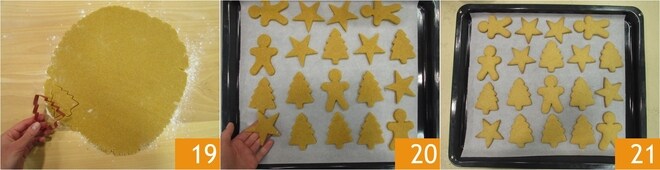 Formen Sie die Kekse, indem Sie die gewünschten Ausstechformen verwenden 19 und legen Sie sie nach und nach auf ein mit Backpapier ausgelegtes Blech 20. Backen Sie sie im vorgeheizten statischen Ofen bei 185° für 12-15 Minuten. Wenn sie gut goldbraun sind, nehmen Sie sie heraus 21, lassen Sie sie abkühlen und servieren Sie sie so, oder haben Sie Spaß daran, sie mit Royal Icing zu dekorieren.