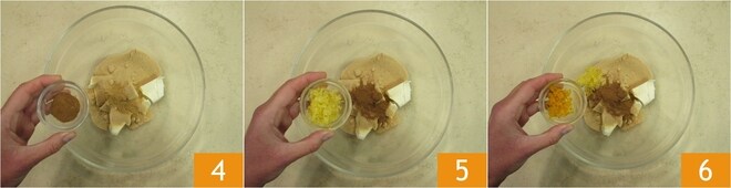 Fügen Sie auch einen Teelöffel Zimtpulver 4, die abgeriebene Schale einer Zitrone und einer Orange 5 6 hinzu.