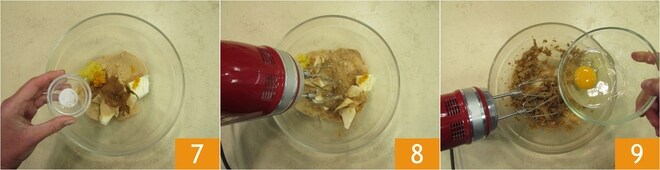 Geben Sie eine Prise Salz 7 hinzu und rühren Sie mit den elektrischen Rührbesen 8, bis Sie eine homogene Masse erhalten. Geben Sie das ganze Ei 9 hinzu und rühren Sie weiter.