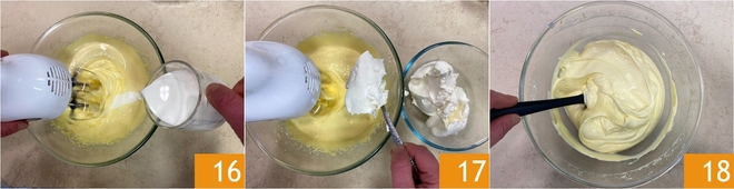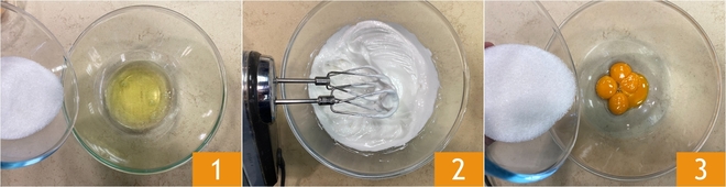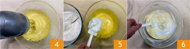 Schlagen Sie mit dem elektrischen Mixer, bis eine schaumige und helle Masse entsteht 4. Fügen Sie den Eischnee langsam mit einem Spatel zur Eigelbmasse hinzu 5 und rühren Sie vorsichtig von unten nach oben, um die Masse nicht zu entlüften 6.
