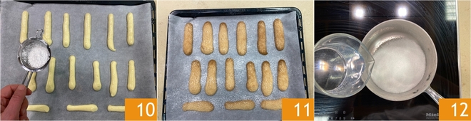 Bestäuben Sie die Löffelbiskuits mit Kristallzucker und Puderzucker 10, dann backen Sie sie im vorgeheizten statischen Ofen bei 180°C für etwa 15 Minuten. Nehmen Sie sie aus dem Ofen und lassen Sie sie abkühlen 11. In der Zwischenzeit bereiten Sie die Creme vor: Geben Sie den Zucker und das Wasser in einen kleinen Topf 12.