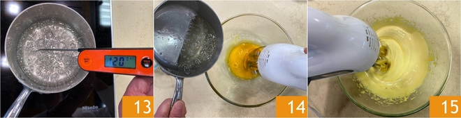 Erhitzen Sie die Mischung auf 121°C und messen Sie die Temperatur mit einem Küchenthermometer 13; wenn Sie kein Thermometer haben, ist der Sirup bereit, wenn sich kleine weiße Bläschen auf der Oberfläche bilden. Kurz bevor die 121°C erreicht sind (also bei etwa 115°C), beginnen Sie, die Eigelbe mit einem elektrischen Mixer zu schlagen. Sobald die 121°C erreicht sind, gießen Sie den Sirup in einem dünnen Strahl auf die Eigelbe, während der Mixer auf niedriger Geschwindigkeit läuft 14. Schlagen Sie weiter, bis die Masse vollständig abgekühlt ist 15.