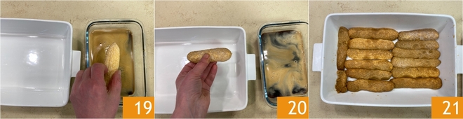Bereiten Sie den Kaffee mit der Mokkakanne zu und lassen Sie ihn abkühlen. Nun können Sie Ihr Tiramisu zusammenstellen: Nehmen Sie eine Auflaufform, tauchen Sie die Löffelbiskuits in den Kaffee 19 und legen Sie sie auf den Boden 20, um die erste Schicht zu bilden 21.