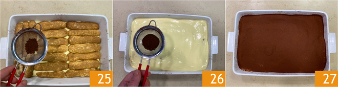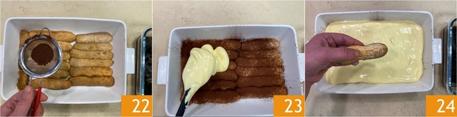 Bestäuben Sie mit einer Schicht Kakaopulver 22, dann verteilen Sie die Hälfte der Creme 23. Nun formen Sie die zweite Schicht: Legen Sie die im Kaffee getränkten Löffelbiskuits darauf 24.