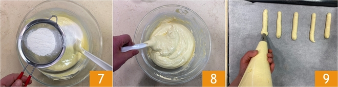 Nun sieben Sie nach und nach die trockenen Zutaten in die Schüssel: Reismehl, Kartoffelstärke 7, Maisstärke, Backpulver und Xanthan. Rühren Sie vorsichtig von unten nach oben weiter, bis eine homogene Masse entsteht 8. Füllen Sie den Teig in einen Spritzbeutel mit einer glatten Tülle von 12 mm Durchmesser und formen Sie Stangen von etwa 10-12 cm Länge auf ein gebuttertes und mit Backpapier ausgelegtes Backblech 9.