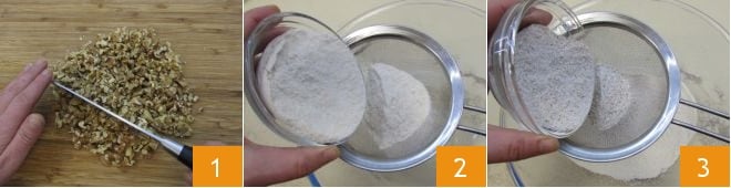 Um das Walnussbrot zuzubereiten, beginnen Sie damit, die bereits geschälten Walnüsse mit einem Messer grob zu hacken 1. Dann sieben Sie in einer großen Schüssel die Mehle: das Vollkorn-Reismehl 2, das Buchweizenmehl 3,