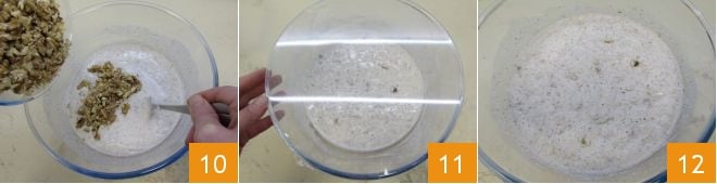 Zum Schluss geben Sie auch die gehackten Walnüsse hinzu 10. Decken Sie die Schüssel mit Frischhaltefolie ab 11 und lassen Sie den Teig 2 Stunden im ausgeschalteten Ofen mit eingeschaltetem Licht gehen. Nach der Gehzeit hat sich Ihr Teig etwa verdoppelt 12.