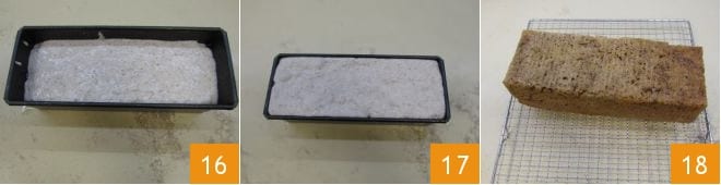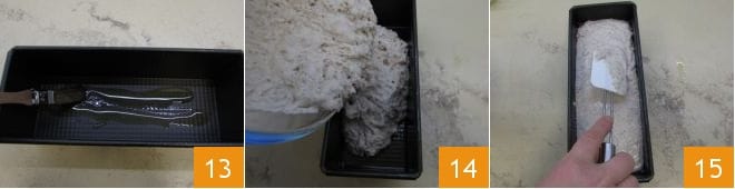 Nehmen Sie eine rechteckige Form von 26X10 cm (die für einen Kastenkuchen ist in Ordnung), fetten Sie sie mit Pflanzenöl am Boden und an den Rändern ein 13. Gießen Sie den Teig in die Form 14 und glätten Sie ihn mit einem Spatel 15;