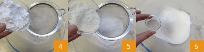 die Kartoffelstärke 4 und das Maismehl 5. Fügen Sie dann die Trockenhefe hinzu 6,