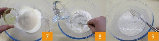 und den Honig 7; beginnen Sie, die Zutaten mit einer Gabel zu vermischen und gießen Sie dabei das Wasser bei Zimmertemperatur nach und nach hinzu 8. Der Teig sollte ziemlich flüssig sein 9.