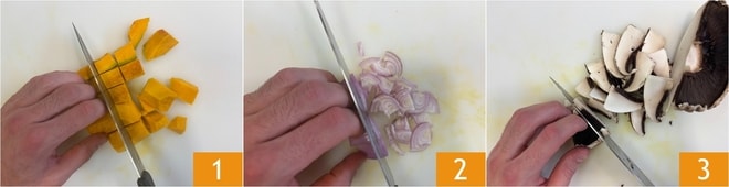 Um die Gnocchetti mit Kürbiscreme, Pilzen und Ricotta zuzubereiten, reinigen Sie den Kürbis und schneiden ihn in Stücke 1. Schälen Sie die Schalotte und schneiden sie in Scheiben 2. Reinigen Sie die Pilze und schneiden sowohl die Pleurotus als auch die Portobello in Scheiben 3.