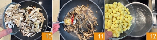 Die Pilze hinzufügen 10 und bei starker Hitze anbraten, dabei mit Salz abschmecken; es dauert etwa 10 Minuten. Sobald sie eine Kruste bilden, vom Herd nehmen, Knoblauch und Chilischote entfernen 11 und beiseitestellen. Die Gnocchetti in gesalzenem kochendem Wasser kochen 12.