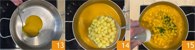 In der Zwischenzeit die Kürbiscreme in die Pfanne geben 13. Sobald die Gnocchetti an die Oberfläche kommen, in die Kürbiscreme abseihen 14 und mischen, dann Schnittlauch und einen Spritzer Öl hinzufügen 15.