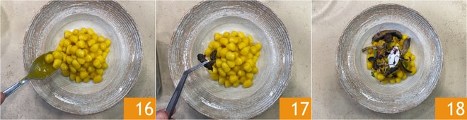 Die Gnocchetti anrichten 16 und die sautierten Pilze hinzufügen 17, dann mit einer Ricotta-Quenelle abschließen. Mit Sprossen und Kürbiskernen garnieren und Ihre Gnocchetti mit Kürbiscreme, Pilzen und Ricotta sofort servieren 18!