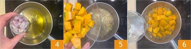 In einem kleinen Topf die Schalotte mit Olivenöl goldbraun anbraten 4, dann den Kürbis hinzufügen 5 und bei mittlerer Hitze einige Minuten anbraten. An dieser Stelle das Wasser hinzufügen 6 und 15 Minuten bei mittlerer Hitze kochen lassen.