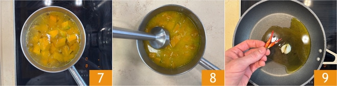 Wenn der Kürbis weich ist 7, vom Herd nehmen und mit einem Stabmixer zu einem glatten und samtigen Püree mixen 8. Die Kürbiscreme beiseitestellen und mit dem Kochen der Pilze fortfahren: einen Schuss Öl in eine Pfanne geben und eine Knoblauchzehe und halbierte Chilischote goldbraun anbraten 9.