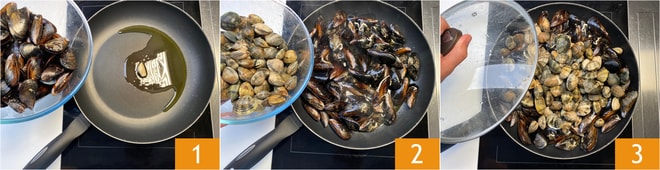 Um die Gnocchi aus dem Meer vorzubereiten, könnt ihr mit der Reinigung der Miesmuscheln und der Reinigung der Venusmuscheln beginnen. Gebt dann in eine sehr große Pfanne oder einen Topf das Öl, die ganze Knoblauchzehe und die Miesmuscheln 1. Fügt auch die Venusmuscheln hinzu 2 und lasst sie sich mit geschlossenem Deckel öffnen 3, indem ihr die Pfanne gelegentlich schüttelt. Es wird nur wenige Minuten dauern.