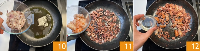 Gebt einen Spritzer Öl in dieselbe Pfanne wie zuvor, fügt die Tintenfische hinzu 10 und lasst sie einige Augenblicke anbraten, salzen und mit dem Holzlöffel umrühren; sie sollten nur versiegelt werden. Dann fügt die Garnelen hinzu 11 und lasst sie ebenfalls einige Augenblicke anbraten, bevor ihr mit Weißwein ablöscht 12.