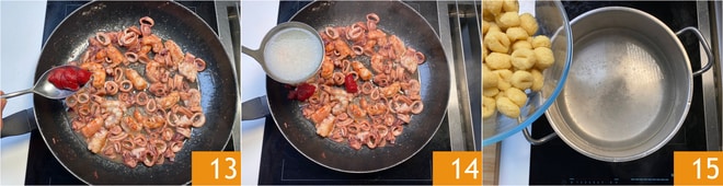 Sobald der Alkohol verdampft ist, könnt ihr das Tomatenmark hinzufügen 13, mit Kochwasser verdünnen, dann umrühren und ihr seid bereit, die Gnocchi zu kochen (nach der auf der Verpackung angegebenen Zeit) 15.
