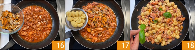 In den letzten Augenblicken des Kochens fügt ihr dem Tintenfisch- und Garnelensugo auch die Miesmuscheln und Venusmuscheln hinzu 16, schaltet die Hitze ab und gießt die Gnocchi direkt in die Pfanne 17, würzt mit Pfeffer nach Geschmack und frischen Basilikumblättern 18 und beträufelt mit etwas rohem Öl. Die Gnocchi aus dem Meer sind servierfertig!
