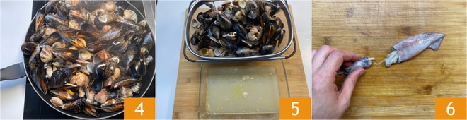 Sobald sie sich geöffnet haben 4, könnt ihr sie abgießen und die gefilterte Flüssigkeit in einen Topf geben, genügend Wasser hinzufügen, um die Gnocchi später zu kochen 5. Entfernt die Schalen von Miesmuscheln und Venusmuscheln (ihr könnt einige ganze für die Dekoration der Teller aufbewahren). Dann nehmt die bereits gereinigten und gehäuteten Tintenfische, trennt den Kopf und behaltet die Tentakel 6.